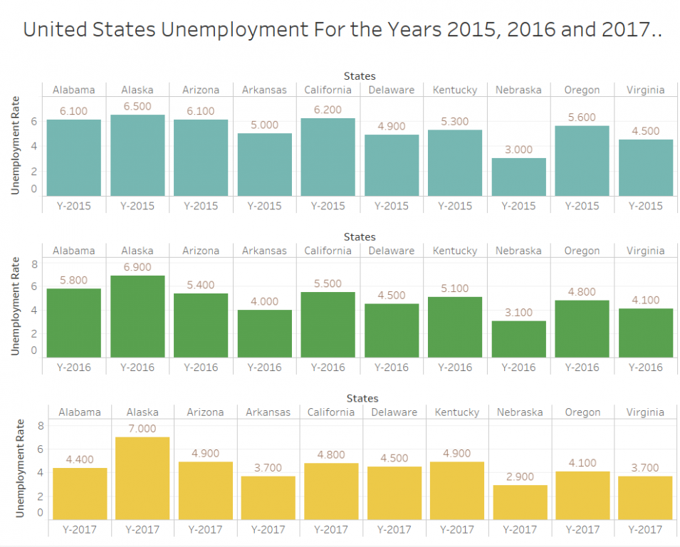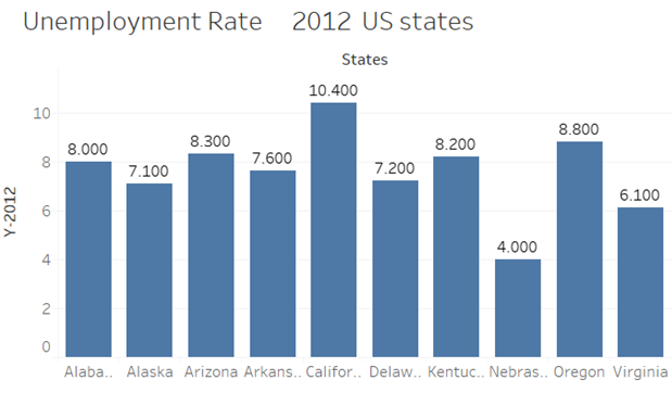The Treemap in Tableau provides a colour range (usually between 2 major colours) to indicate the unemployment rate where else, in Power BI different colours were used to identify the blocks. Also, the actual numeric value is can be easily seen in Tableau with the colour range indicative of how close the values are to each other. Therefore, it is easier to relatively compare the values in Tableau generated Treemap than that of Power BI.