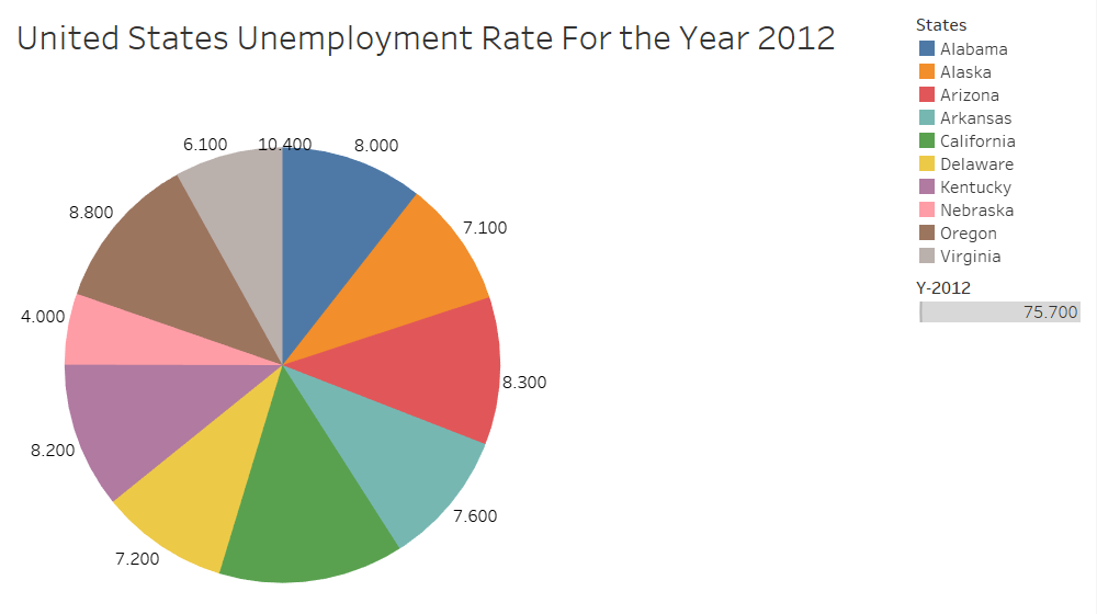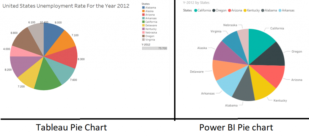 The pie chart visualisation in Tableau provides the unemployment rate for each state where else, Power BI does not provide it. Tableau visualisation is easier in comparison to Power BI when identifying ratios for slightly different values. However, Power BI is suitable for quickly identifying the states in the pie chart because the Power BI legend uses the state names as seen below.