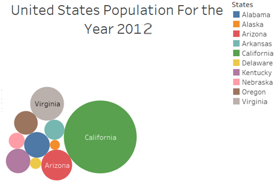The above figure represents the population size of the United States in 2012. Packed bubbles have some resemblance to the Tree maps, however, the size of each category of data is represented by the radius of the circle. The larger the radius, the bigger the population and vice versa. In this scenario California has the highest population size followed by Arizona. Packed bubbles are useful in showing quantity-wise relationship without using actual figures.