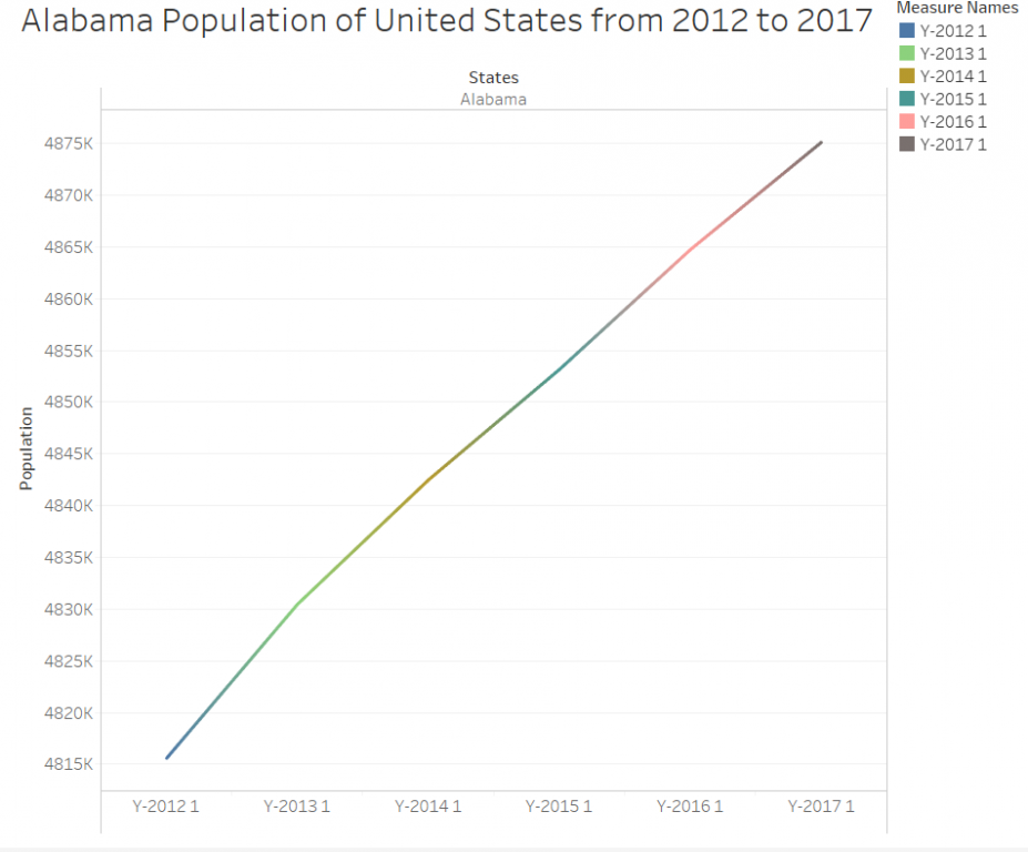 The above figure represents the population size of the United States between the year 2012-2017. A line chart is useful for forecasting and detecting trends over a time period. In the figure above, the population of the United States is seen to increase yearly so one can safely predict that it will continue to increase yearly.