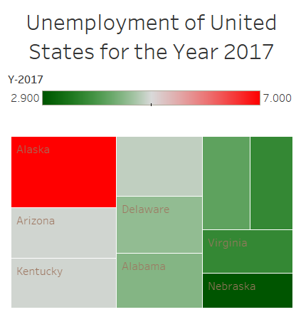 The figure above represents the unemployment rate in the United States in 2017. Treemaps displays data via nested rectangles. It is useful in showing the visual differences in sizes of different data using the rectangle size as well as how close the values are to each other by the various colour coding just like a Highlight table. E.g. Alaska has the biggest population hence the biggest rectangle and a different colour while Arizona and Kentucky have the same value hence the same rectangular size and colour. Tree map is useful in showing quantity-wise relationship without using actual figures.