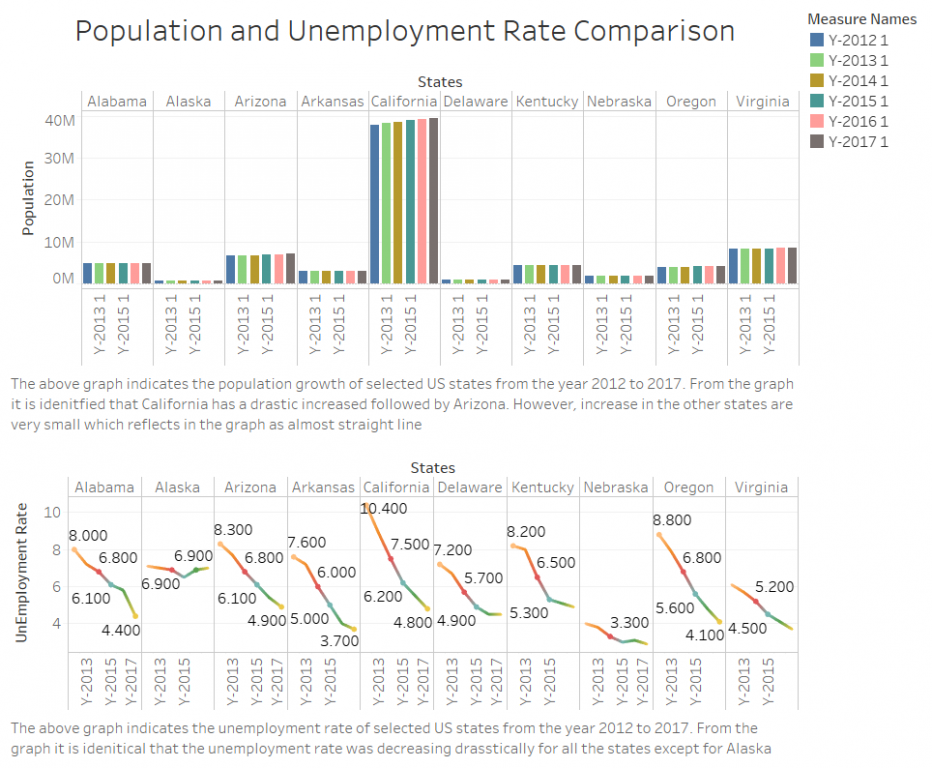 The story is to study the relationship between the population and the unemployment rate for some of the states in US which are Alabama, Alaska, Arizona, Arkansas, California, Delaware, Kentucky, Nebraska, Oregon and Virginia. The dataset was downloaded from the following link: