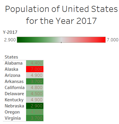 The figure above represents the population of the United States in 2017. This is useful to compare information that fall within the same category and vice-versa. It displays the values also to indicate the actual values for values that are too close to tell. From figure 8 above, it is clear that Alaska belongs in a different category (7000) while California and Kentucky belong to a similar category with values of 4800 and 4900 respectively.