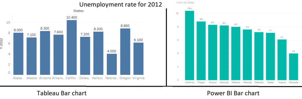 The bar chart generated from Tableau and Power BI are almost the same. However, Tableau allows the data analyst to sort the states in the X-axis in alphabetical order which is missing in Power BI.