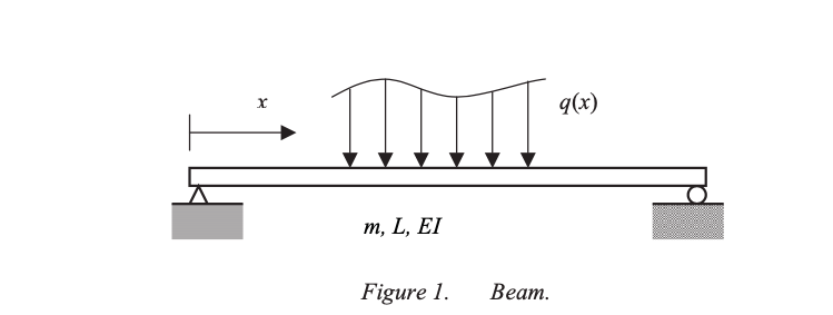 4. A simply supported beam shown in Figure 1 has a Young’s modulus E 2.110 N/m , a Length L 3.00 m, and a moment of inertia I bh3 12 m4 where it ?s rectangular cross section width is b 0.17 m and the cross section height is h 0.12 m. The beam has the total weight Q 25104 N which can be considered as a constant distributed load qx Q L .