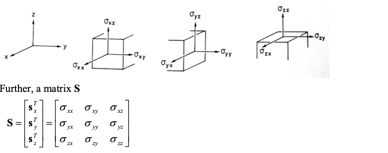 3. Consider a body subjected to a traction vector in a point. What does the vectors in the figure below represent and what are the two component types, respectively, s xx , s yy , s zz and sxy , sxz , syx called? (1.5p)