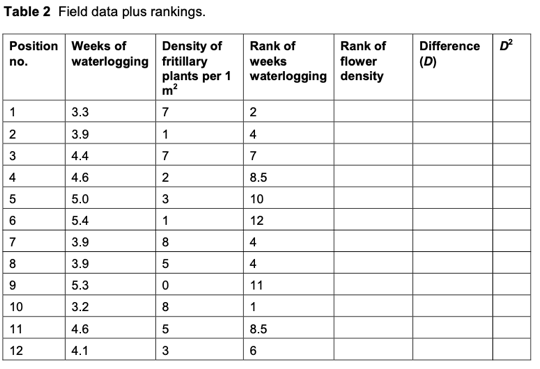 To use the Spearman rank correlation test, it is first necessary to rank the data. The weeks of waterlogging have been ranked in Table 2.