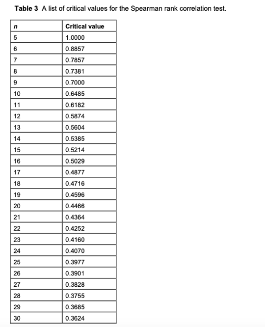 (h) Compare your calculated value of rs with the appropriate critical value from Table 3 and comment on whether the relationship can be considered statistically significant.