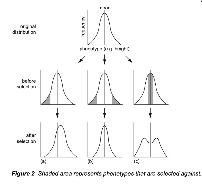Identify what kinds of natural selection are operating in Figure 2 a - c below. Describe what would happen to the mean of the trait subjected to each kind of selection