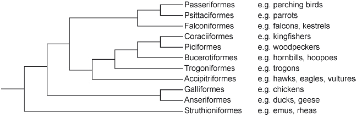 Look at the phylogeny shown in Figure 1, which shows a suggested phylogeny for a selection of orders of birds, and answer the questions that follow.