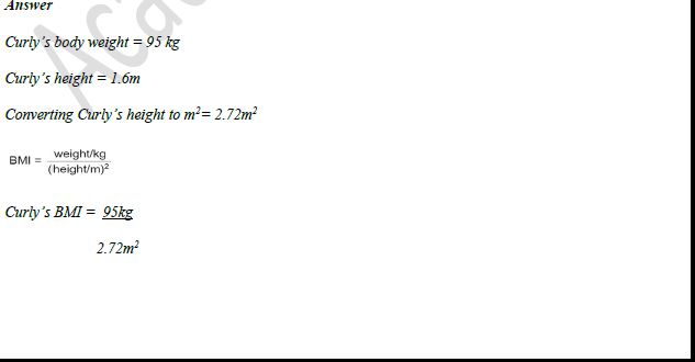 From the above table above Curly’s current BMI is 34.9kg/m2 classified as obese class i. This suggests that Curly is now suffering from obesity.
