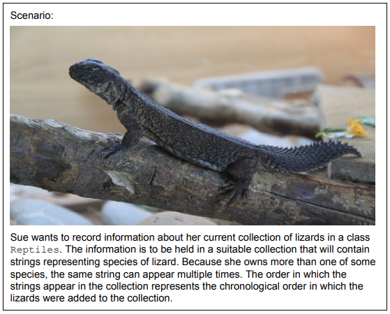 (iii) Write the public instance method addLizard() that takes a String argument representing a lizard to add to the collection, and returns the current number of lizards in the collection. You can assume that the argument is a valid species name, appropriately capitalised. (4 marks)