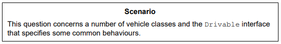 (f) Suppose that SportsCar is a subclass of Car. Describe what needs to be added to the class SportsCar (if anything) so that SportsCar will implement the interface Drivable. Briefly justify your answer. (4 marks)