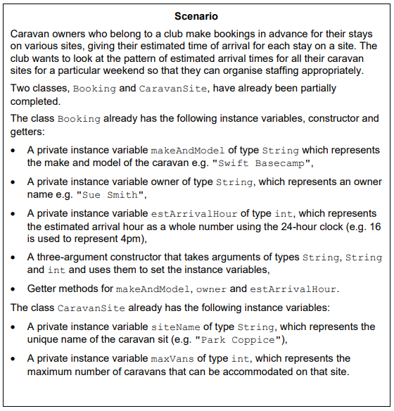 Assume that the class CaravanSite has a public instance method getBookings() that returns a list of the bookings for that site.