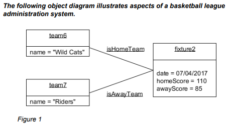 A. isAwayTeam is the association which illustrates the relationship between team7 and fixture2. B. The diagram shows the state of part of the system at a particular point in time. C. The diagram shows that the state of fixture2 is date, homeScore and awayScore. D. The diagram shows a collaboration between team6 and fixture2. E. The diagram shows that name is an attribute of team7.