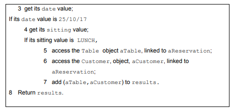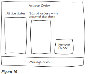 Imagine that a user interface designer has worked on the Remove Order use case and has decided that the user will select from a scrollable list of all order due dates. When the user makes this selection a second scrollable list will display, for each order with the selected due date, the unique identification number of that order.