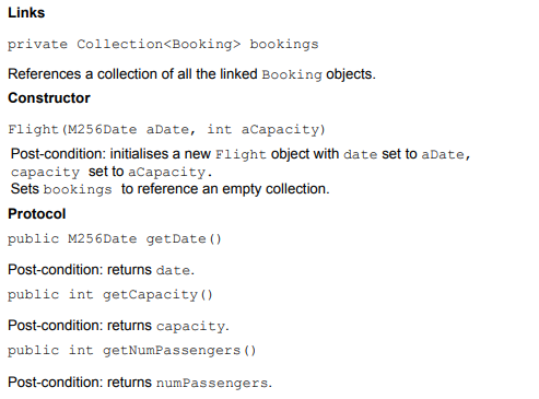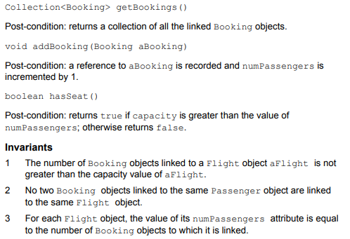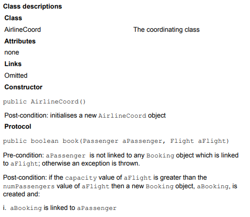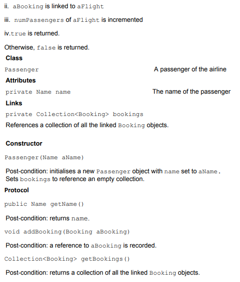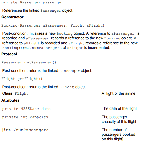 Consider the class diagram in Figure 11 and class descriptions, extracted from an implementation model for a small airline administration system, the Airline System. Then answer part (a) which follows. You are advised to read the questions first and then refer to the extract from the implementation model in order to answer them. Note that this question contains four parts in all. The last three parts, (b), (c) and (d), are based on dynamic models which are given later.