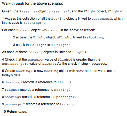 The user identifies a passenger and a flight. The flight must not have been booked already by the passenger. If the flight is already fully booked then the user is informed of this but otherwise the system records the booking of the passenger for the flight with the date of the booking.