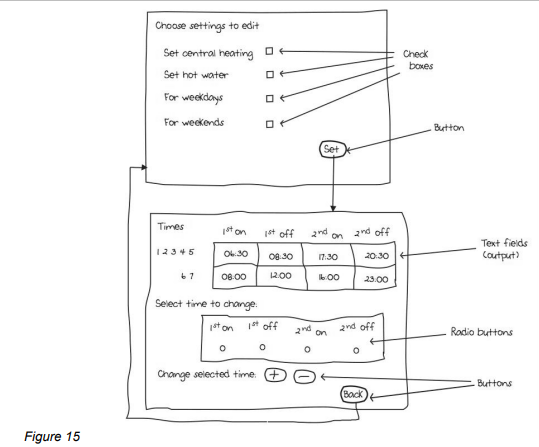 (a) This part of the question is about improving an initial prototype graphical user interface (GUI) design for a central heating controller application to run on a desktop computer as part of a home automation system. Read the descriptions below, then answer the questions that follow.