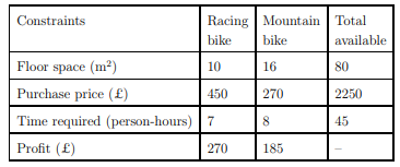 A small workshop assembles two types of bike, racing bikes and mountain bikes, built from kits. The kits arrive in a batch each morning and at the end of the day the finished bikes are moved to a local wholesale showroom, to be sold on to cycle retailers. Once assembly of a bike has been started it must be completed the same day so that the workshop can be cleared and left empty to start on the next batch in the morning. The limitations for the workshop are the total floorspace of 80m2, the total amount of money available to buy kits, which is £2250 per day, and the total number of working hours of the employees, which is 45 hours per day. The following table gives for each type of bike: the workshop floor space required, the purchase price of each kit, the number of person-hours required to assemble that bike, and the profit from selling it.