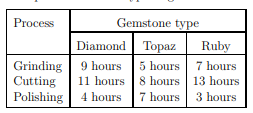 A gemstone producer prepares three types of gemstone for use in jewellery, starting from the rough stones. There are three processes which must be carried out in the following order: rough grinding, cutting and polishing, each of which takes place in its own specially designed machine. Each machine can treat just one stone at a time, though all three machines can operate at once. The times taken for each process for each type of gemstone are as follows.