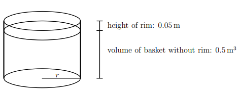 In order to make the basket sufficiently strong for this customer’s requirements, the base will cost three times as much to manufacture per square metre, and the rim twice as much to manufacture per square metre, as the cost of manufacturing the side. The basket manufacturer wants to minimize the cost of manufacturing each basket and requires a mathematical model to determine the radius of the circular base in order to do so.