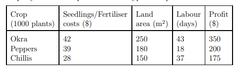 A farming co-operative in the Caribbean produces organic tropical produce for the UK market, specifically okra, peppers, and chillies. The following table summarises the cost of seedlings and organic fertiliser, the land area required, the labour time needed and the profit, all per year for 1000 plants for each type of crop.
