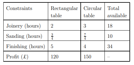 A small workshop makes two types of tables: standard rectangular tables and de luxe circular tables. Both types are made from the same wood and after the wood has been cut each table has to go through three processes: joinery, sanding and finishing. At the end of the day the finished tables are moved to a local wholesale showroom, to be sold on to furniture retailers. Once production of a table has been started, it must be completed the same day so that the workshop can be cleared and left empty to start on the next batch in the morning. The limitations for the workshop are the total amount of specialist labour time per day available for each process. The following table shows the time required for each process for each type of table, and the total labour time available per day for each process. It also shows the profit from selling each type of table.