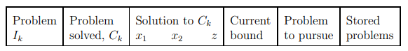 (b) Solve the model using the branch-and-bound method, stating clearly the branching strategy used, and hence determine the number of tables of each type that should be produced each day. Solve each continuous sub-problem graphically and show the details of the solution in a table of the following kind.