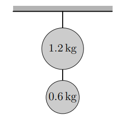 A ball of mass 1.2 kg is suspended by a chain from a ceiling, and a ball of mass 0.6 kg is suspended by a chain from the first ball, as shown.