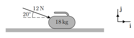 A curling stone of mass 18 kg lies on smooth horizontal ice, as shown below. It is pushed by a force of magnitude 12 N, acting at an angle of 200 to the horizontal, which causes the stone to move along the ice.