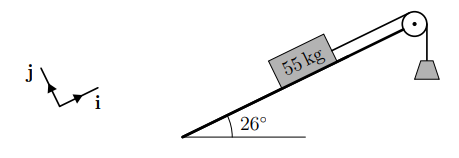 (b) Find expressions for the component forms of the four forces, in terms of unknown magnitudes where appropriate. In doing this, take the Cartesian unit vectors i and j to point parallel and perpendicular to the slope in the directions shown above.