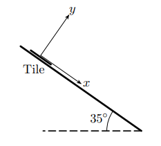 (b) Find expressions for the component forms of the three forces, in terms of the mass m (in kg) of the tile and any unknown magnitude(s) where appropriate. Take the x- and y-axes to point parallel and perpendicular to the slope, respectively, in the directions shown in the diagram above.