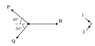 A particle, which remains at rest, is acted on by three forces, P, Q and R, and no others. The force P acts at an angle of 400 to the horizontal, the force Q acts at an angle of 500 to the horizontal and the force R acts horizontally to the right, as shown. The force P has magnitude 55 N. Let Q = |Q| and R = |R|. Take the Cartesian unit vectors i and j to be parallel to P and Q, respectively, in the directions shown.