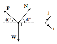 (a) Find expressions for the component forms of the three forces, F, N and W, taking the directions of the Cartesian unit vectors i and j to be as shown in the diagram (i is in the opposite direction to F and j is in the same direction as N). Denote the magnitudes of F and N by F and N respectively.
