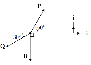 (a) Find expressions for the component forms of the three forces P, Q and R, taking the directions of the Cartesian unit vectors i and j to be as shown in the diagram (j is parallel to R), and denoting the magnitudes of Q and R by Q and R, respectively.