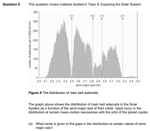 (b) One of the gaps occurs at an orbital period of 4.74 years. According to Kepler’s 3rd law, what would be the semi-major axis corresponding to such an orbit? (The orbital period of the Earth is 1 year, and its orbit has a semimajor axis of 1 AU.)