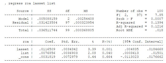 The following Stata output refers to a regression for the determinants of the return on assets for a sample of 100 banks in a particular year. The variable definitions are as follows: roa = percentage return on assets lasset = natural logarithm of asset value (in £ billions)