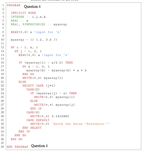 4. Read the following code, then determine what the output would be if the input value for n is 2, and for a are 6.1, 2.8 and 4.3 in that order. [18 marks]