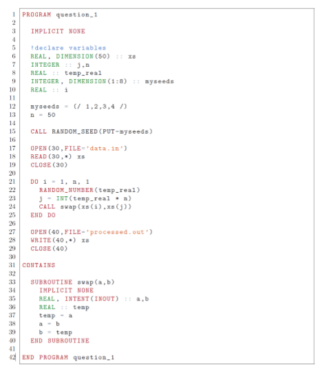 (d) The code reads 50 numbers from input file “data.in” in array xs, makes random shuffle of array elements (using the a random j index in the range 1..n) and writes resulting array in output file “processed.out”.