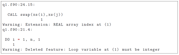 (b) Warnings: variable i of type real is used as index of array xs on line 24 and on line 21 as loop variable.Possible correction is to replace line 10 on: