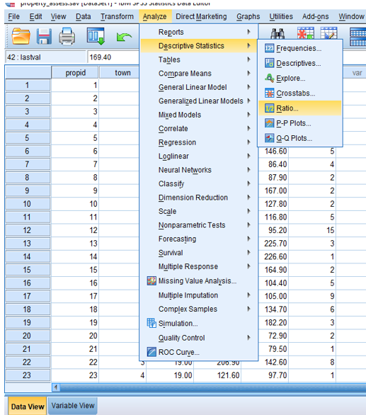 Secondly, go to the data view, then from the menus, choose: Analyse => Descriptive Statistics => Ratio