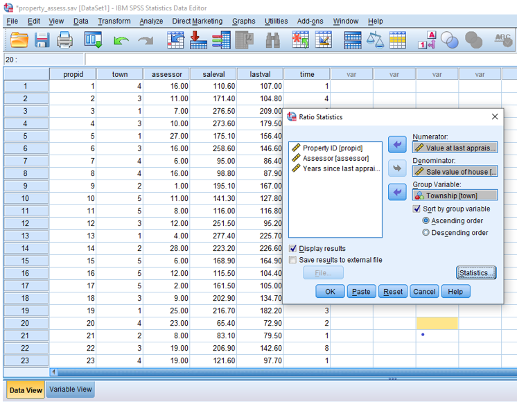Thirdly, select value at last appraisal as the numerator variable, the Sale value of a house as the denominator variable, and then, most importantly, Select Township as the grouping variable. Then Click Statistics.