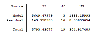 From the output, we see that the degrees of freedom of the model, and residuals are 3 and 16 respectively, while that of whole data (total) is 19.