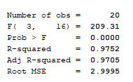 F(3, 16) is the F-statistics of an ANOVA test run on the model. The F-statistics is the ratio of the mean sum of squares (ms) of the model to that of the residual. It measures how the ratio of the explainable mean variance to the unexplainable mean variance is statistically greater than 1. The 3 and 6 simply represents the model’s and residual degrees of freedom respectively. To know how well the predictors (taken together as a group) reliably predicts the dependent variable, Stata conducts an hypothesis test using the F-statistics. The null hypothesis is that the mean explainable variance is same as the mean unexplainable variance. From the table, we see that the mean sum of squares of the model is about 209.31 times greater than that of the residual.