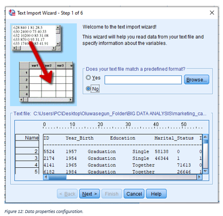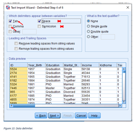 After clicking “Open” then your data will go through data properties configuration which is six (6) stages in total. The stage I will ask you to pay more attention to is stage 4 where the data delimiter is selected. If wrong delimiter is selected then your data may not be properly arranged when out of the data properties configuration stage. NOTE: SPSS will set the appropriate properties for the data, however, please check the details in each of the stage to be double-sure that SPSS is on track. For instance, as shown in Figure 13, the data we shall be working with is comma separated value (csv), so, by default SPSS selected “Tab” and “Space” as the delimiter for the data which is wrong; it should “Tap” and “Comma.” When I included “Space” the cases with words separated by space were shifted to the next column which eventually disorganized the data… you may give it a trial!