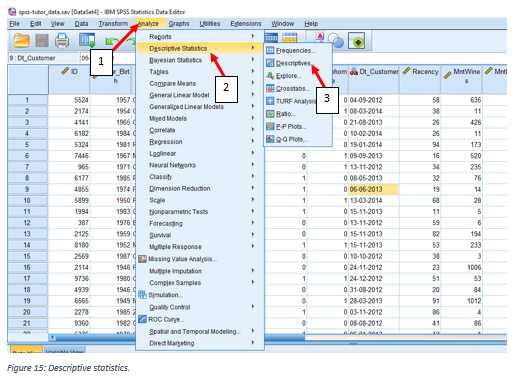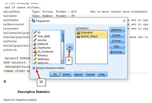 We may as well do frequency analysis by following similar sequence as shown in descriptives statistics. But in this case, “Frequencies…” is selected in Figure 15.