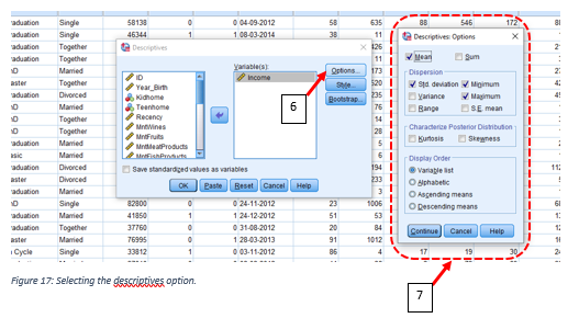 In this case we want the descriptive statistics of the “Income” variable. Click on “Income” as shown in 4 then click 5 to put the variable in the box for the analysis.