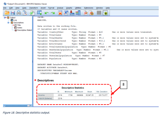 In this article we have covered: (1) how to load data into SPSS; (2) how to configure the data properties; (3) how to find descriptive statistics of the data; (4) how to find frequency of the data; and (5) how to edit the output results.