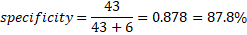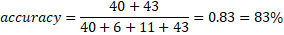 For example, if for 100 observations, a model hits 40 (true positives), correctly rejects 43 (true negatives), raises 6 false alarms (false positives), and misses 11 (false negatives); we can represent these in a contingency table as shown below: